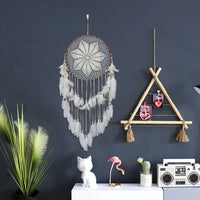 Découvrez l'Attrape-rêves centre rosace, une pièce exceptionnelle qui combine beauté et fonctionnalité. Avec ses dimensions impressionnantes de 105 cm de hauteur et un cercle de 40 cm de diamètre, cet attrape-rêves se distingue par son design en rosace. Le cercle principal arbore un motif délicat en forme d'étoile, tandis que la partie inférieure, ornée de plumes blanches, évoque l'art traditionnel du macramé.